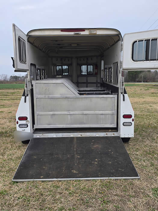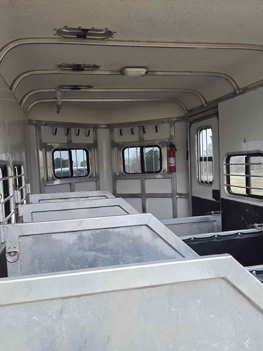 This trailer has dual hydraulic jacks and can be operated separately or together. The partitions can be taken out to make a box stall for a couple babies or a mare & foal, the front of the stalls have gates on them as well.