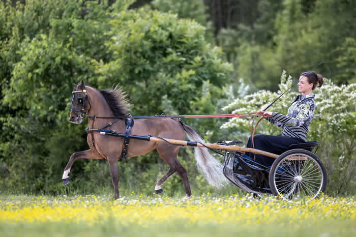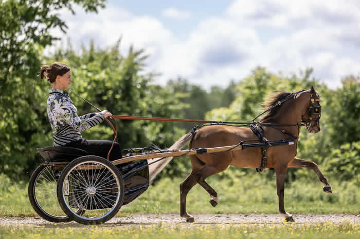 He's ultra talented and is best suited for professional amateur or someone working with a trainer. He's one of the easiest horses to drive but in hand he is all 'boy" and he moves while being hooked.