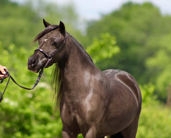 This black beauty has a pedigree that reads like a who's-who in the show ring winner's circle. She is sired by the tiny dynamo, AE BANDITO BEY who goes back to Z.J.'s Windwalker and carries the prolific lines of Rudolph's Golden Comanche.